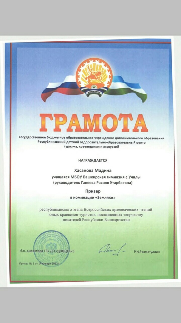 По итогам Республиканского этапа конкурса Всероссийских краеведческих чтений юных краеведов-туристов, обучающаяся 8А класса -Хасанова Мадина стала ПРИЗЕРОМ в номинации “Земляки” (руководитель: Ганеева Расиля Утарбаевна).Поздравляем и желаем дальнейших успехов!