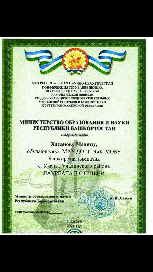 С 13 ноября по 15 декабря 2021г.прошла Межрегиональная научно-практическая конференция по краеведению, посвященная 112-й Башкирской кавалерийской дивизии среди обучающихся общеобразовательных учреждений Республики Башкортостан и субьектов Российской Федерации.Учащаяся гимназии, Хасанова Мадина, стала ЛАУРЕАТОМ 2 степени в номинации “Мои земляки-воины легендарной 112-й Башкирской кавалерийской дивизии”.Руководитель: Ганеева Расиля Утарбаевна.Поздравляем!